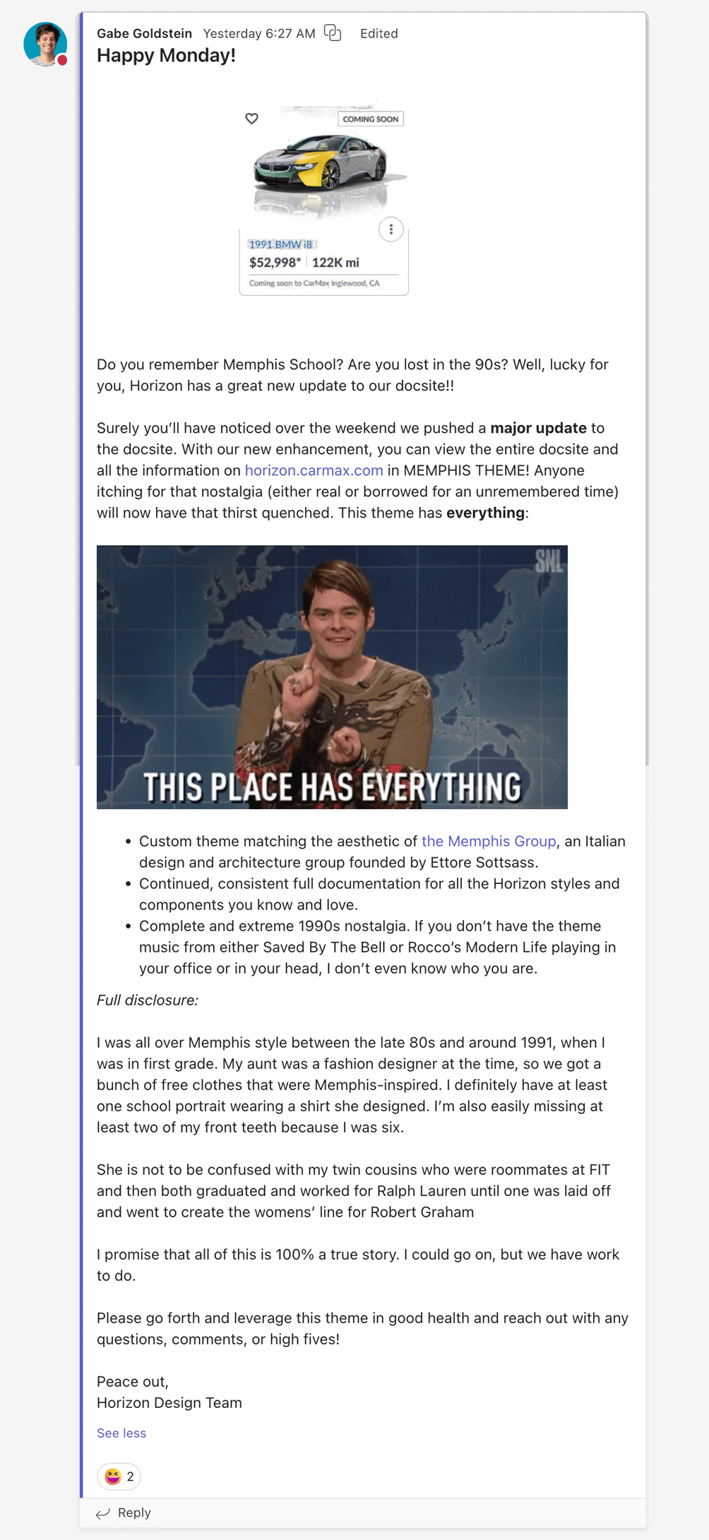I also authored a cheeky announcement message to introduce the theme internally—framing it as a fun discovery, while showcasing our system’s flexibility and extensibility.