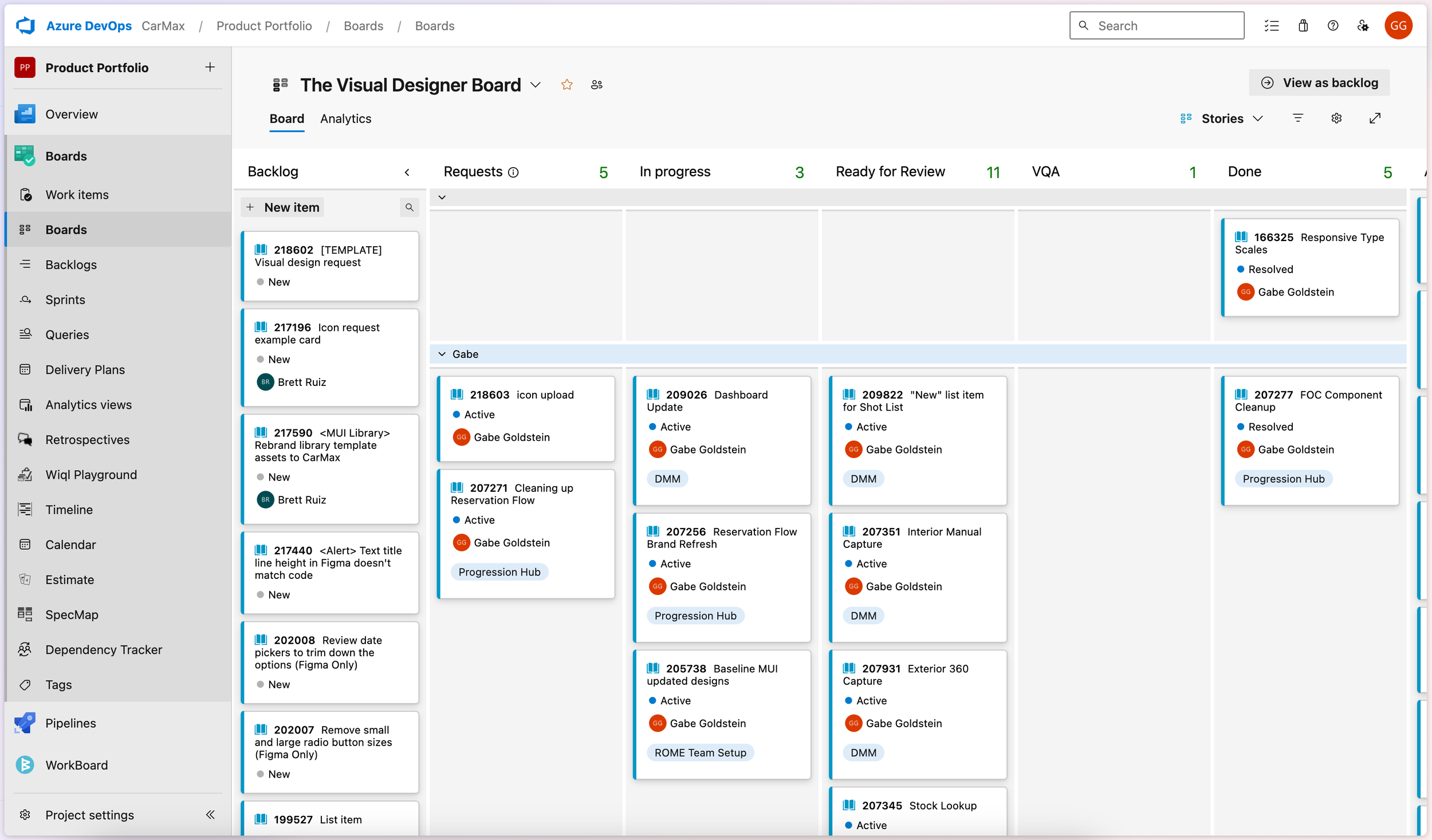 Using Azure DevOps (the agile tool already in use across the org), I created a shared board where we could see all the design systems work happening across product teams in one place.