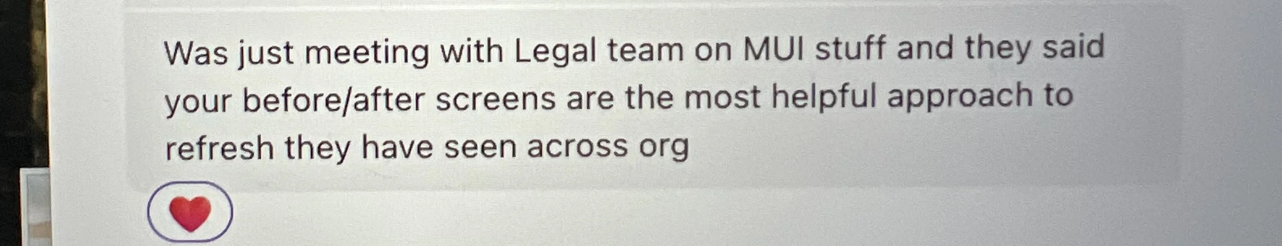 In addition to engineering efficiency, this project also highlighted the value of thoughtful communication. The before/after mockups I prepared for review were specifically praised by the legal team for their clarity and structure, making it easy for them to evaluate compliance and sign off quickly—helping keep the entire project on track.